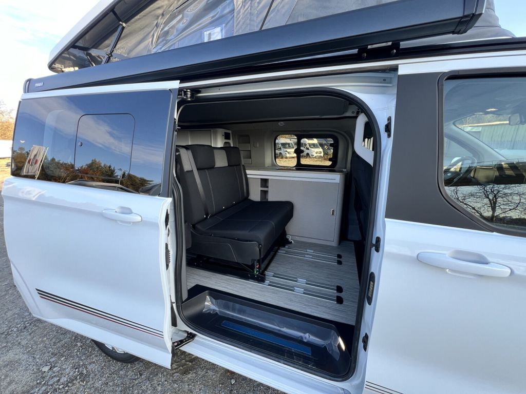 - Holiday Version (C500) (Verdunklung Fahrerhaus, Verdunklung Wohnraum, 3. und 4. Sitzplatz auf Sitzbank inkl. Isofix und Schlaffunktion mit Staufach unter Bank, Liegeflächenerweiterung für Schlafbank, 4 Zurrösen für Schienenboden)