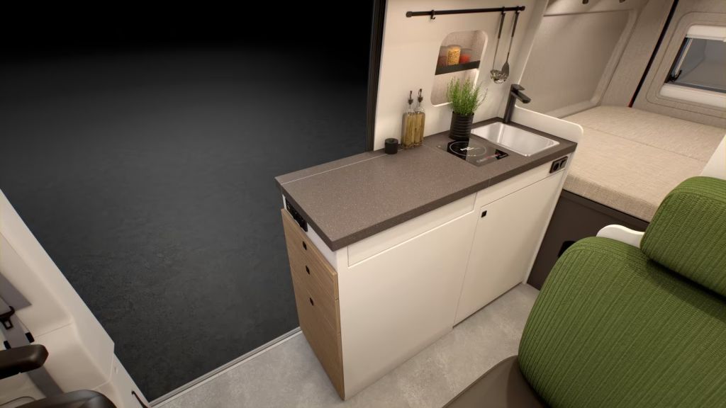 - Küchen-Pack (Vorbereitung Gaskartuschenkochher (klappdeckel), Schneidebrett / Spüle Abdeckung, Kompressor Kühlbox 32 ltr. (mit Auszug), Multifunktionssschiene unter dem Küchenoberschrank)