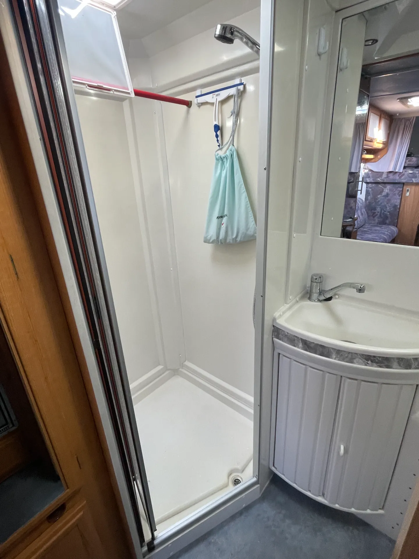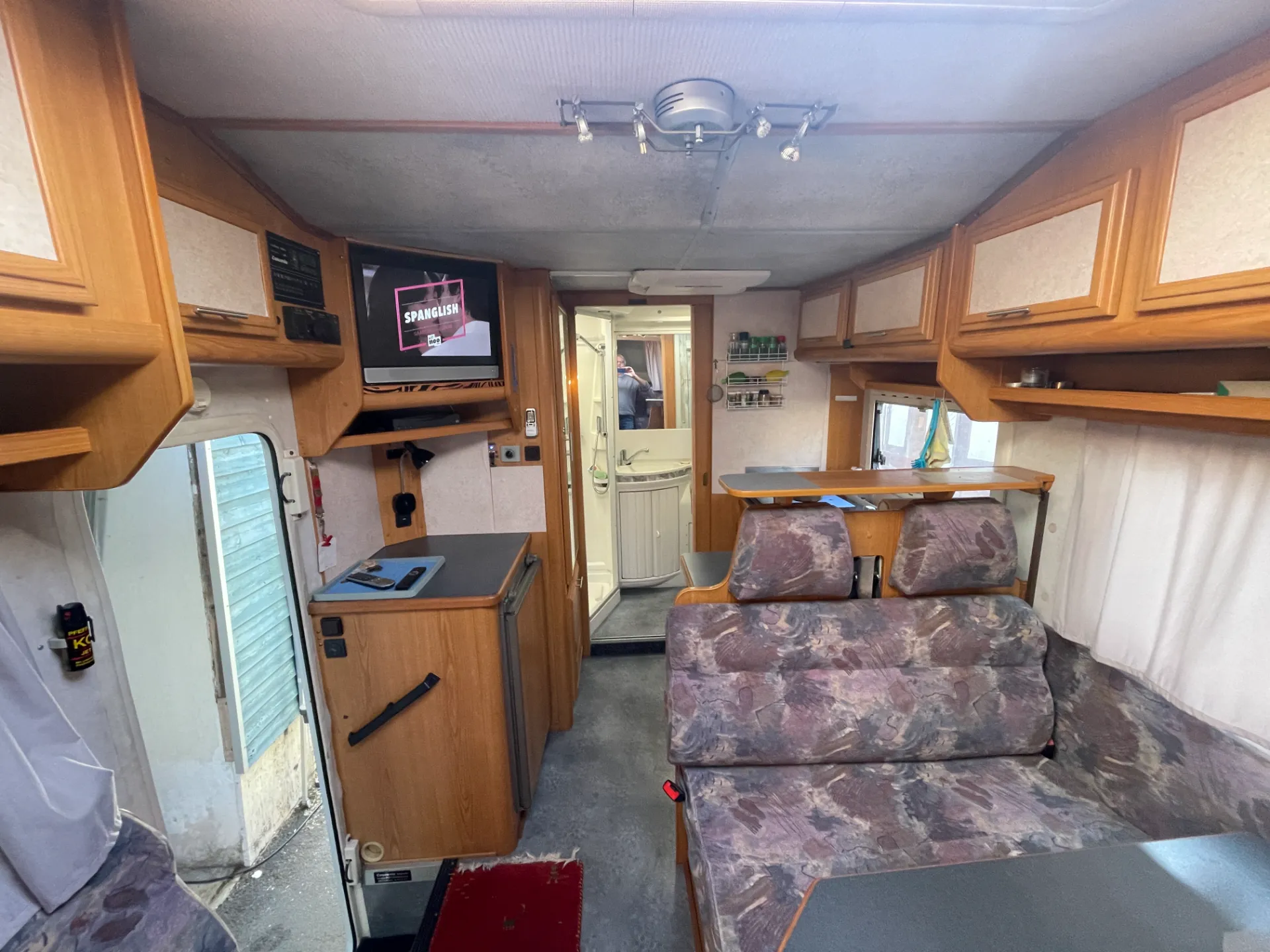 Es ist gemütlich und praktisch eingerichtet, mit L-Küche und Tresen, gemütlicher Sitzgruppe, abgeschlossenem Bad, Alkoven und einer Stehhöhe im Innenraum von ca. 2m!