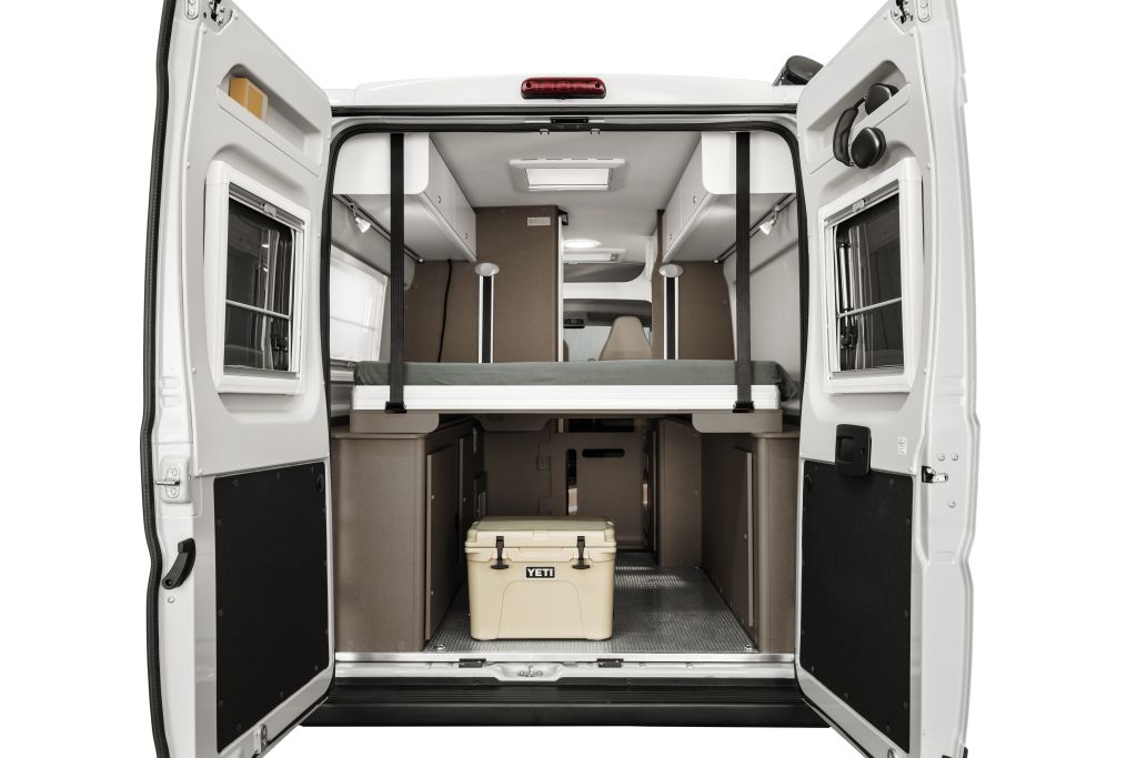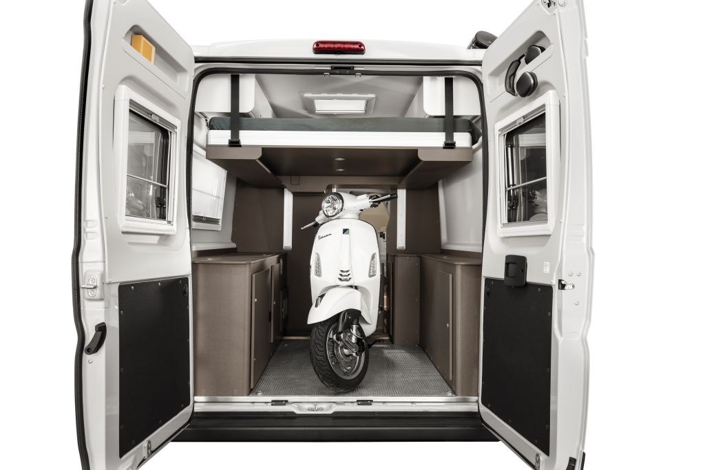 Ob es darum geht, Camping-Ausrüstung, persönliche Gegenstände wie Fahrräder oder Proviant unterzubringen, ausreichender Stauraum ist unerlässlich, um den Wohnbereich des Campervans ordentlich zu halten und gleichzeitig Platz für die Bedürfnisse und Aktivitäten der Reisenden zu bieten. Beim CV 640 PB schafft Etrusco mit der Integration einer neuen Betten-Option im Heckbereich des Fahrzeuges flexiblen Stauraum. Durch die elektrische Höhenverstellung lässt sich die Höhe des Stauraums von 73 Zentimeter individuell auf bis zu 140 Zentimeter erweitern. Das Stauraum-Volumen steigt somit von etwa 1350 Liter auf 2365 Liter. Im Vergleich zu den regulären Campervan-Modellen von Etrusco wurde durch den seitlich optimierten Lagerplatz für Gasflaschen die Breite auf 111 Zentimeter erweitert. Das praktische: Möchte man zum Beispiel ein Bike oder Motor-Roller im Campervan selbst transportieren und gleichzeitig das Bett zum Schlafen oder Ausruhen nutzen, so ist dies nun mit der neuen Campervan-Variante erstmalig ohne Einschränkungen möglich.