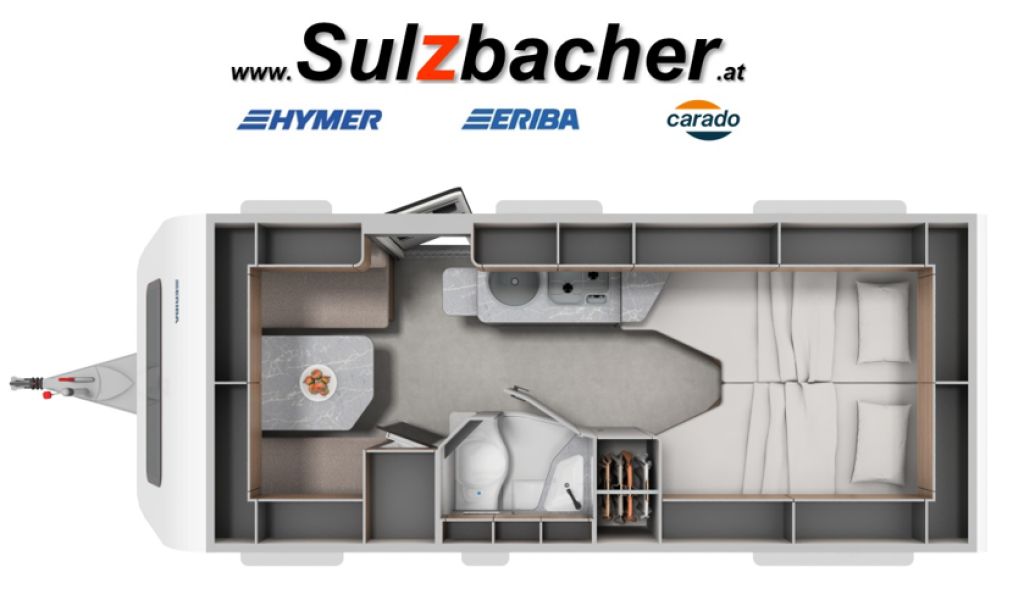 Neu-Wohnwagen ab ca. November bei uns in Eferding. Premium-Wohnwagen mit Längsbetten mit V-Einstieg und großem Stauraum mit Außenklappe links und rechts. Hochwertiger HYMER PUAL Aufbau mit geschäumten Wänden in Aluminium-Glattblech mit besonders guter Isolierung. Preis zzgl, Kosten für Fracht und Eintrag Genehmigungsdatenbank. Irrtum und Änderungen vorbehalten.