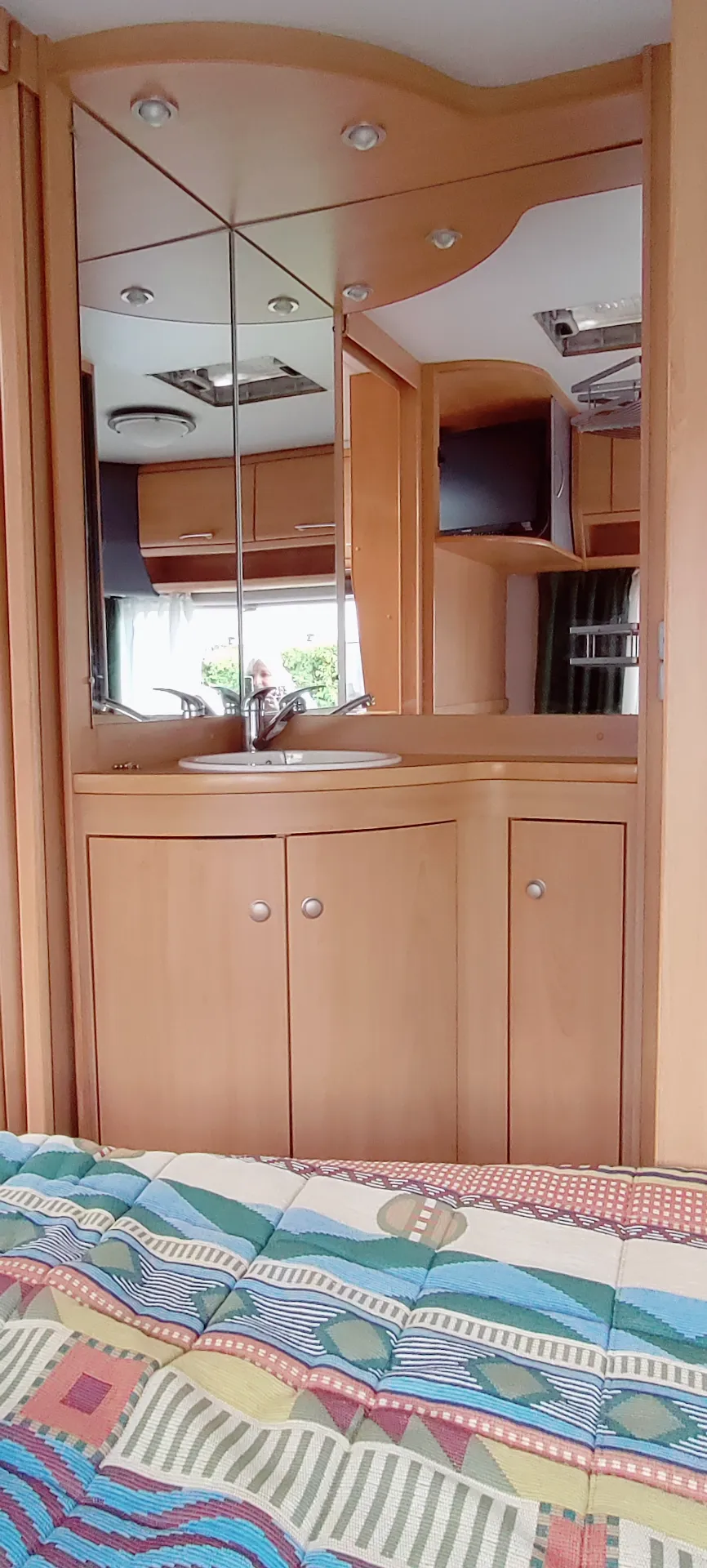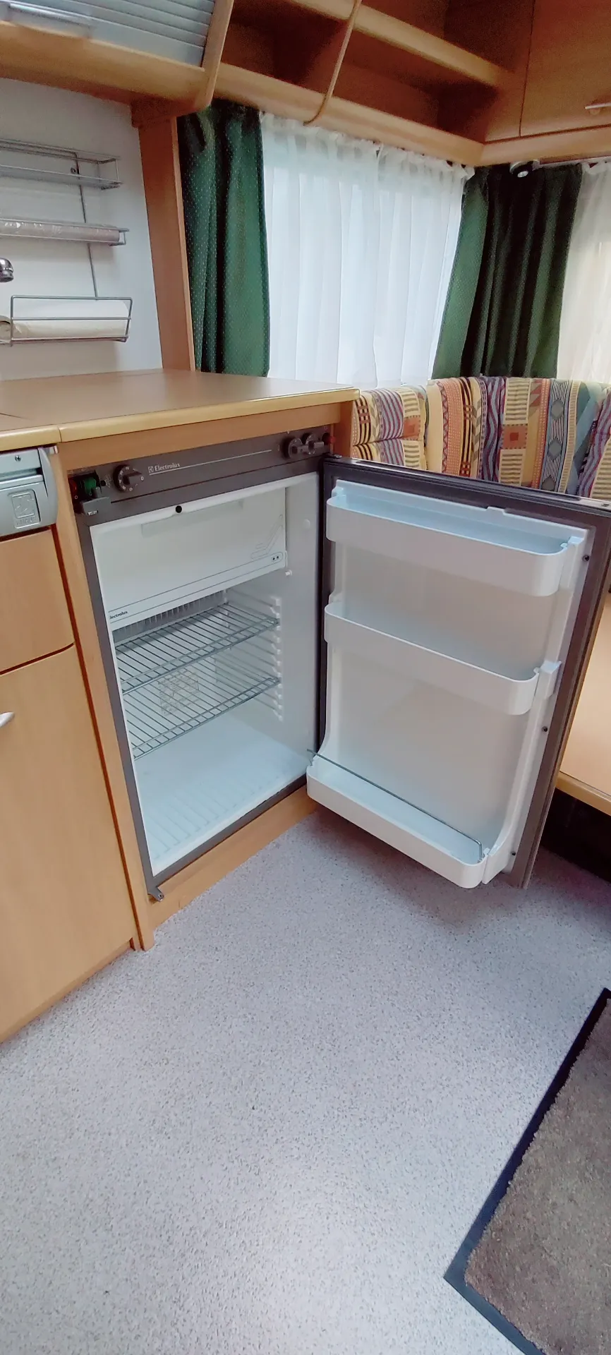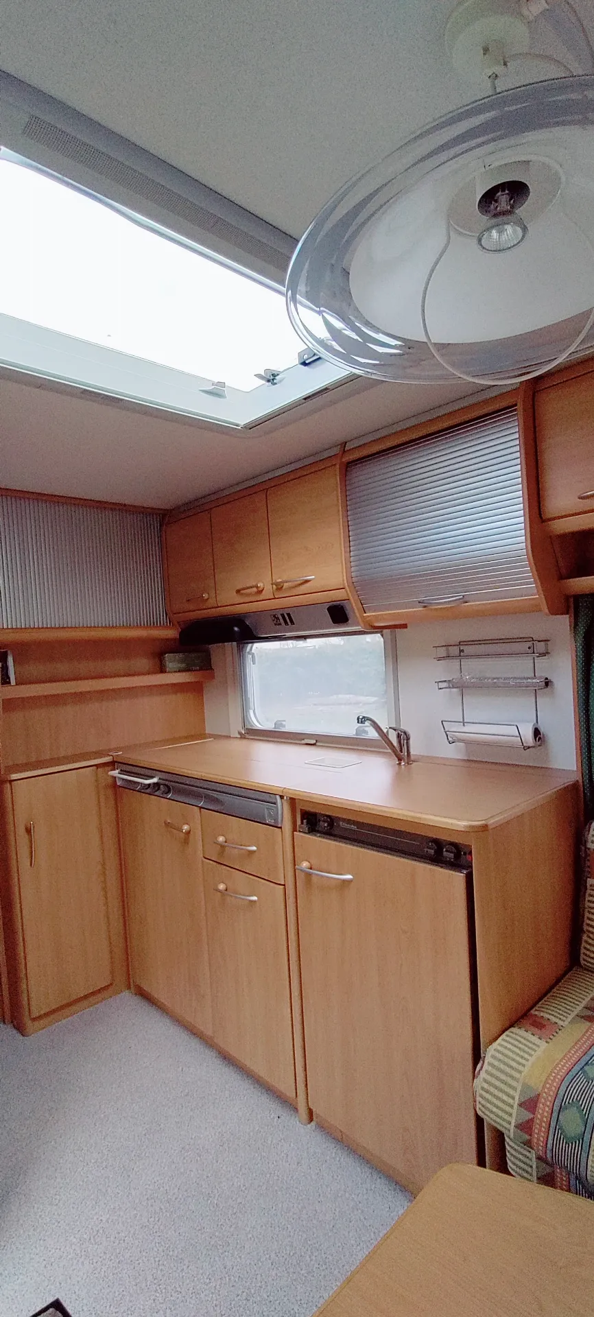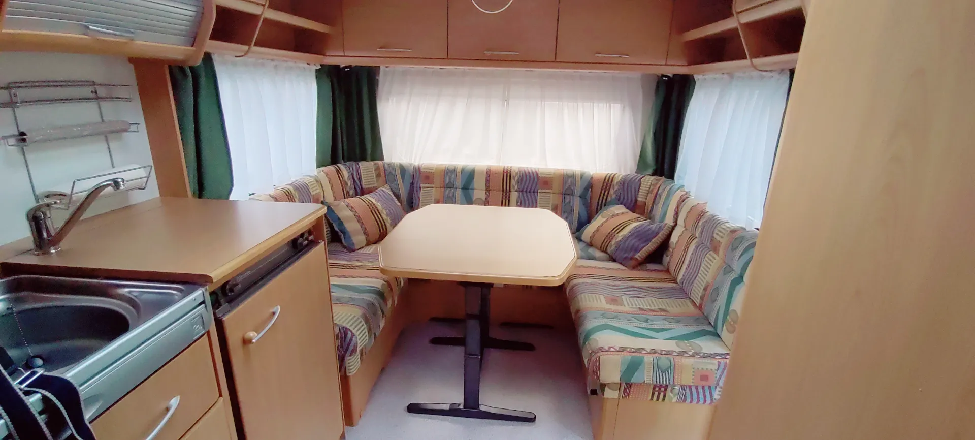 Küche: Voll ausgestattet mit Elektrolux Kühlschrank (Gas/12V/230V), Spüle, 3-Flammen-Gasherd und Dunstabzug