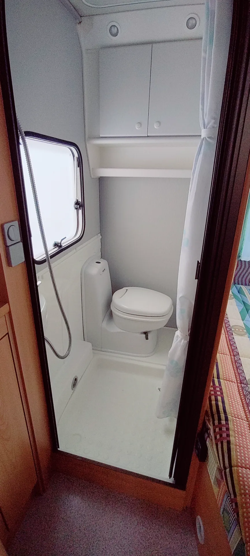 Komfort-Grundriss: Französisches Festbett im Bug, daneben die separate Toilettenkabine mit Dusche.