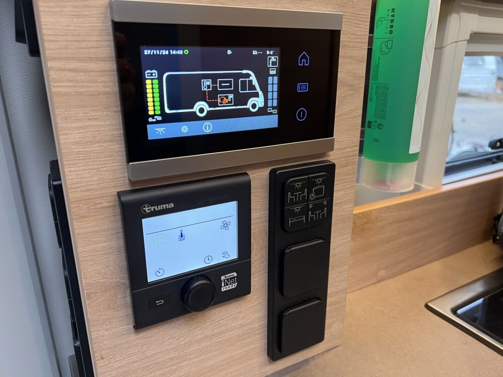 - Energy Basic-Paket (Touch-Control-Panel mit intuitivem Bedienkonzept vernetzter Komponenten, inkl. Innen- und Außentemperaturfühler statt serienmäßigem Control-Panel, Intelligentes Ladegerät mit 25 A Ladeleistung)