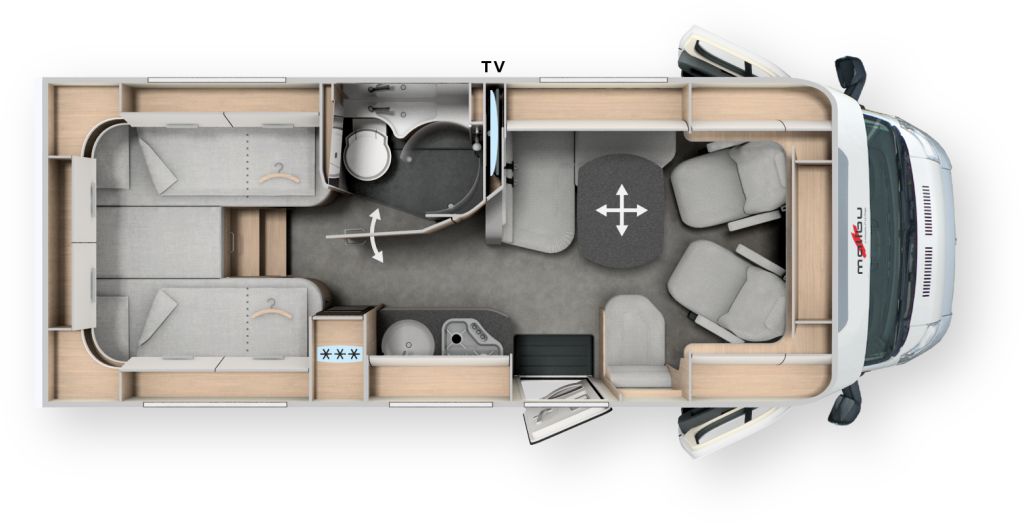 Durch seine kurze Fahrzeuglänge von unter 7 Meter ist der Malibu T 430 KB-LE der perfekte Reisebegleiter. Trotzdem können Sie sich durch die große L-Wohnsitzgruppe mit aufklappbarer Seitensitzbank, der platzsparenden Seitenküche, dem Kombibad mit blickgeschützten Umkleidezimmer oder aber den Längseinzelbetten mit großer Liegelänge auf ganz viel Komfort freuen.
