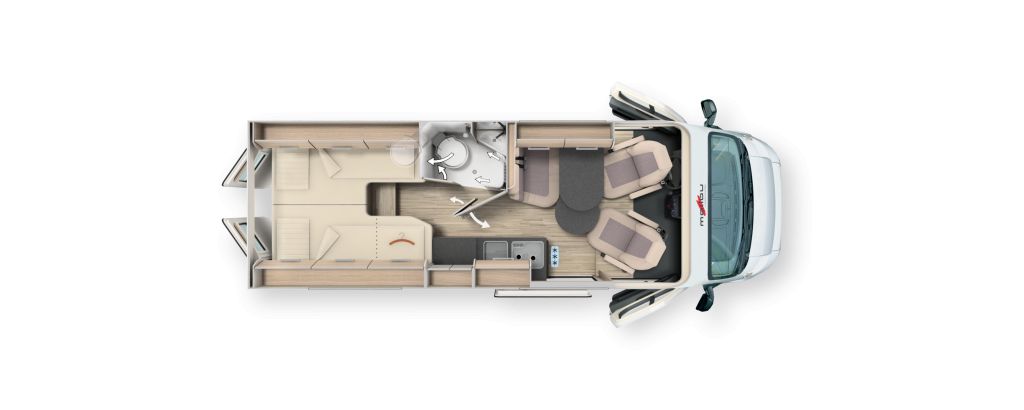 I.V.m. family-for-4-Paket: Es entfallen die serienmäßigen Dachluken über der Sitzgruppe und im Waschraum. Hybrid-Aufstelldach nur i.V.m. Option PREMIUM-FENSTER im Waschraum (außer compact-Modelle) möglich. Nicht möglich i.V.m. Option Umbaukit für Sitzg