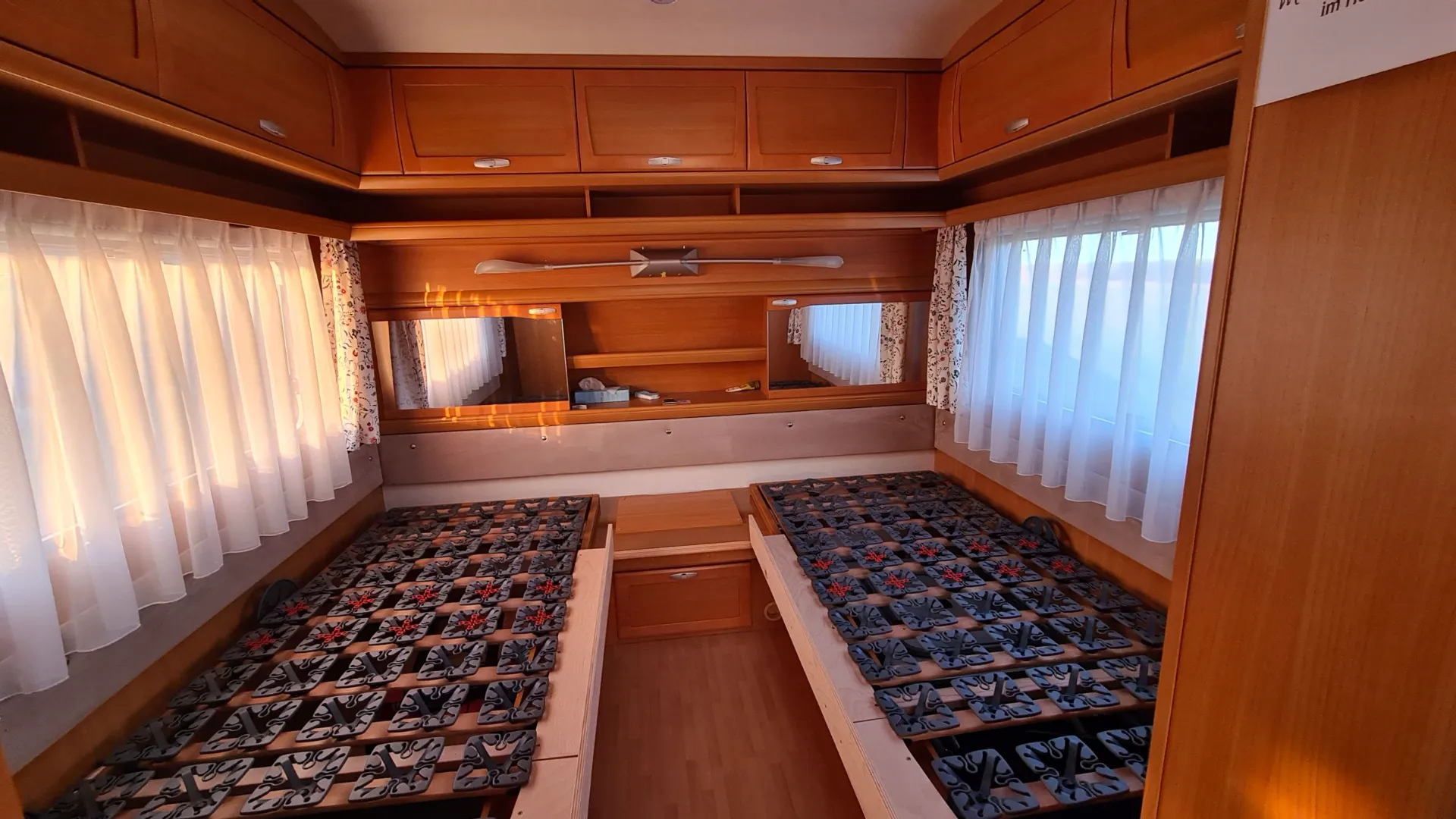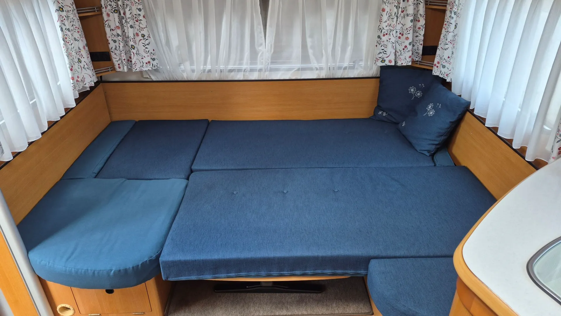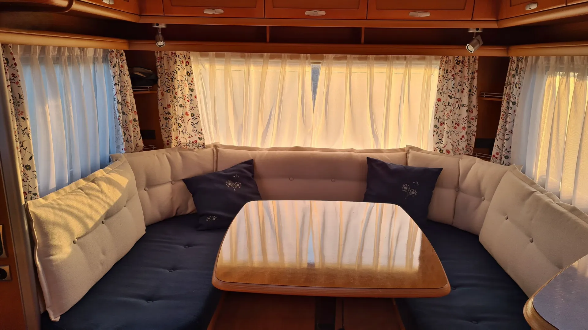 Der ganze Wohnwagen ist mit einem Vorwerk Teppich ausgelegt. Dieser ist auf den Fotos nicht sichtbar, da wir im Winter alle Polster, die Matratzen und Teppiche rausnehmen und im warmen lagern.