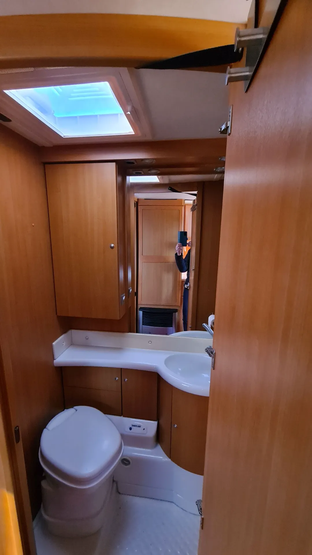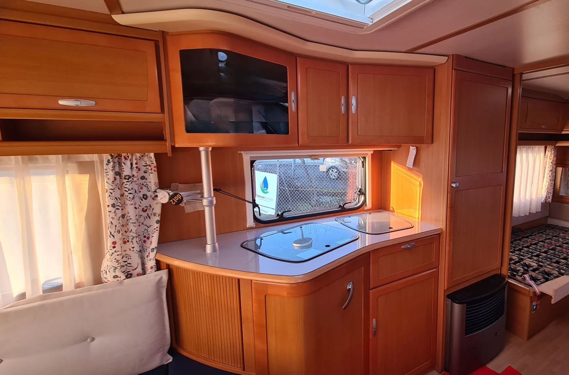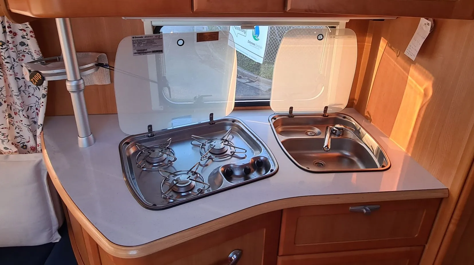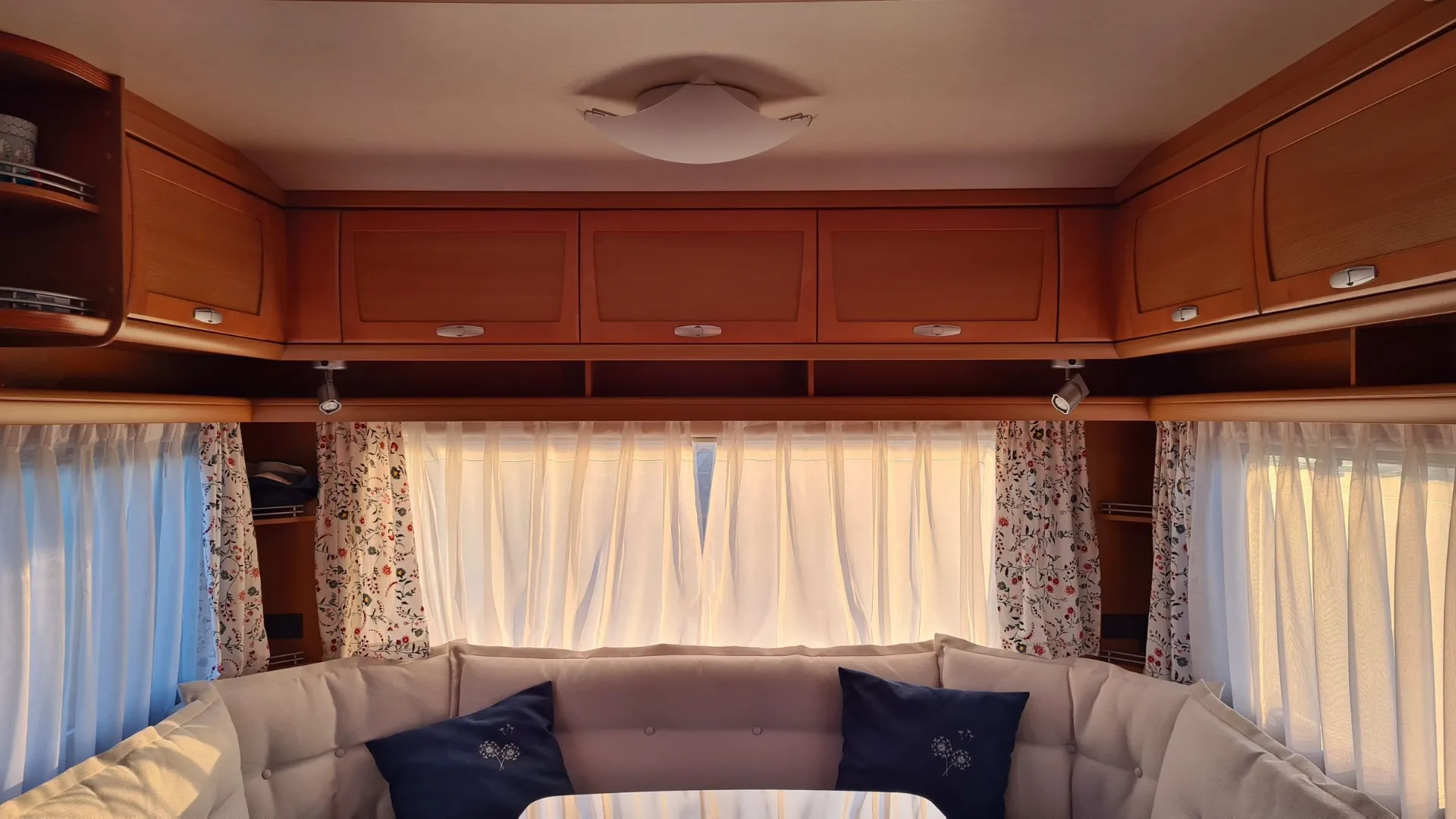 Der ganze Wohnwagen ist mit einem Vorwerk Teppich ausgelegt. Dieser ist auf den Fotos nicht sichtbar, da wir im Winter alle Polster, die Matratzen und Teppiche rausnehmen und im warmen lagern.