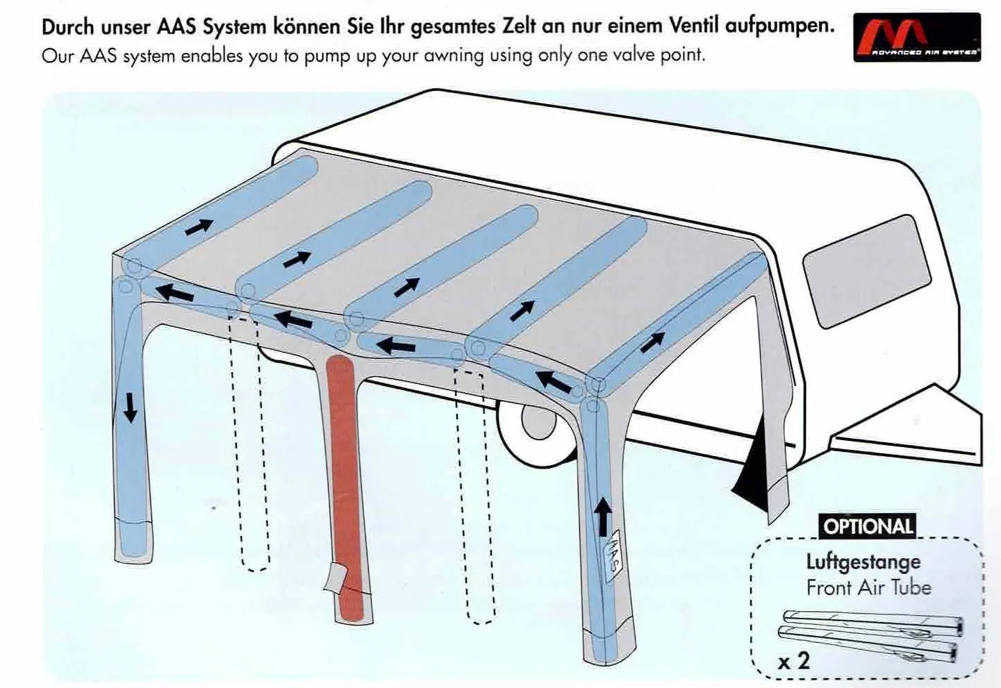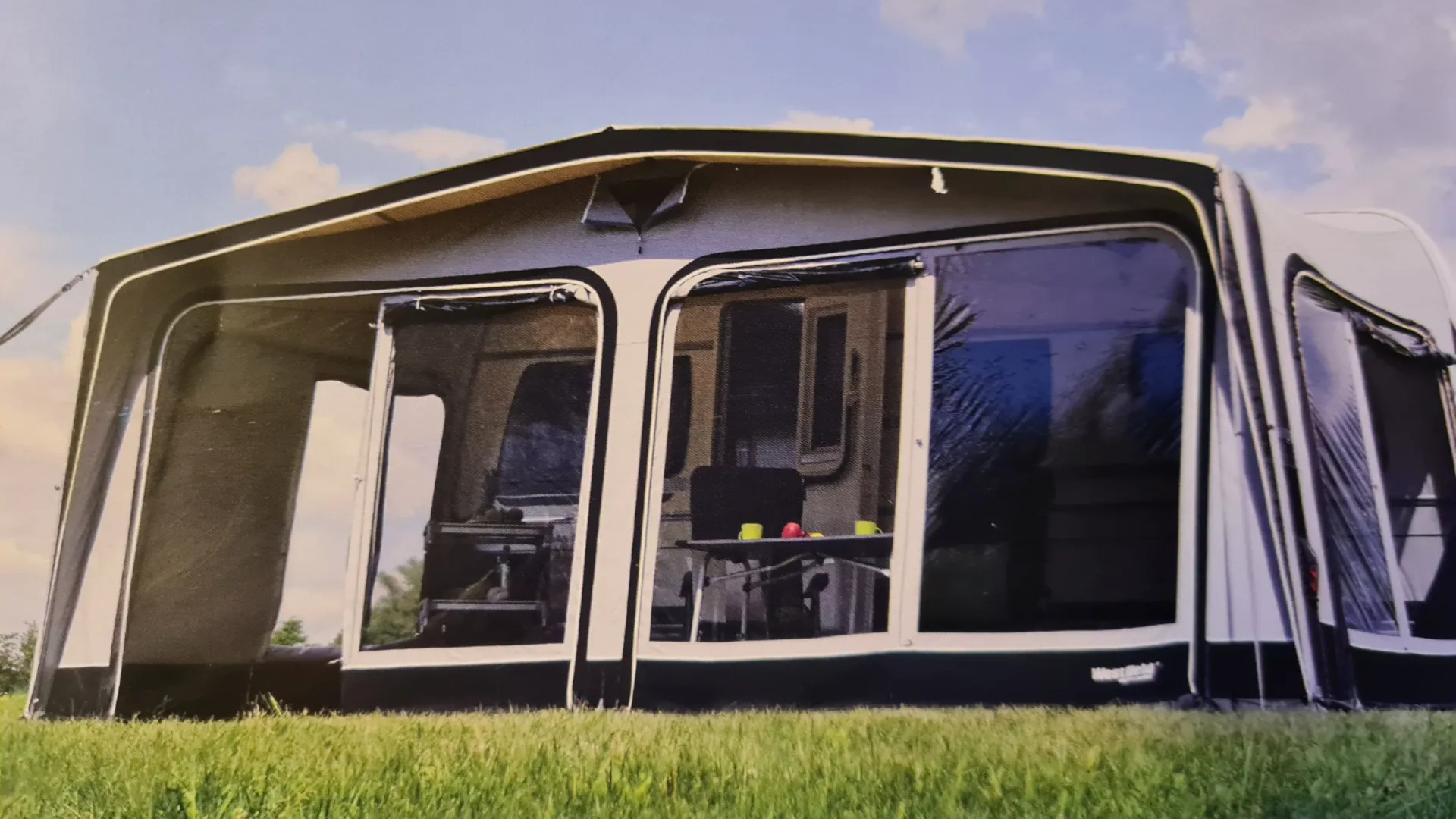 Das dazugehörende in die Keder Schiene volleingezogene Premium Luftvorzelt ist Neu und wurde nur einmal aufgebaut.