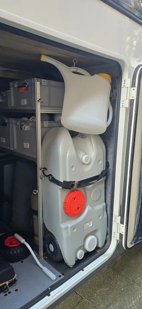 – großer rollbarer Grauwasser-Tank (sehr nützlich, wenn man etwas länger auf einem Platz steht, ohne gleich das ganze Wohnmobil zur Grauwasser-Entsorgung bewegen zu müssen)