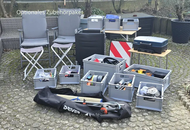 Optional biete ich zum Wohnmobil noch ein auf das Fahrzeug abgestimmtes Zubehör-Paket an. Enthalten sind z.B. Stühle, Tische, Gartenliege, Enders Gasgrill, Außendusche, Euroboxen für das Heckgaragen-Regalsystem, diverse Spanngurte für die Garage, Geschirr- und Kochutensilien, etc. etc. an. Siehe Fotos