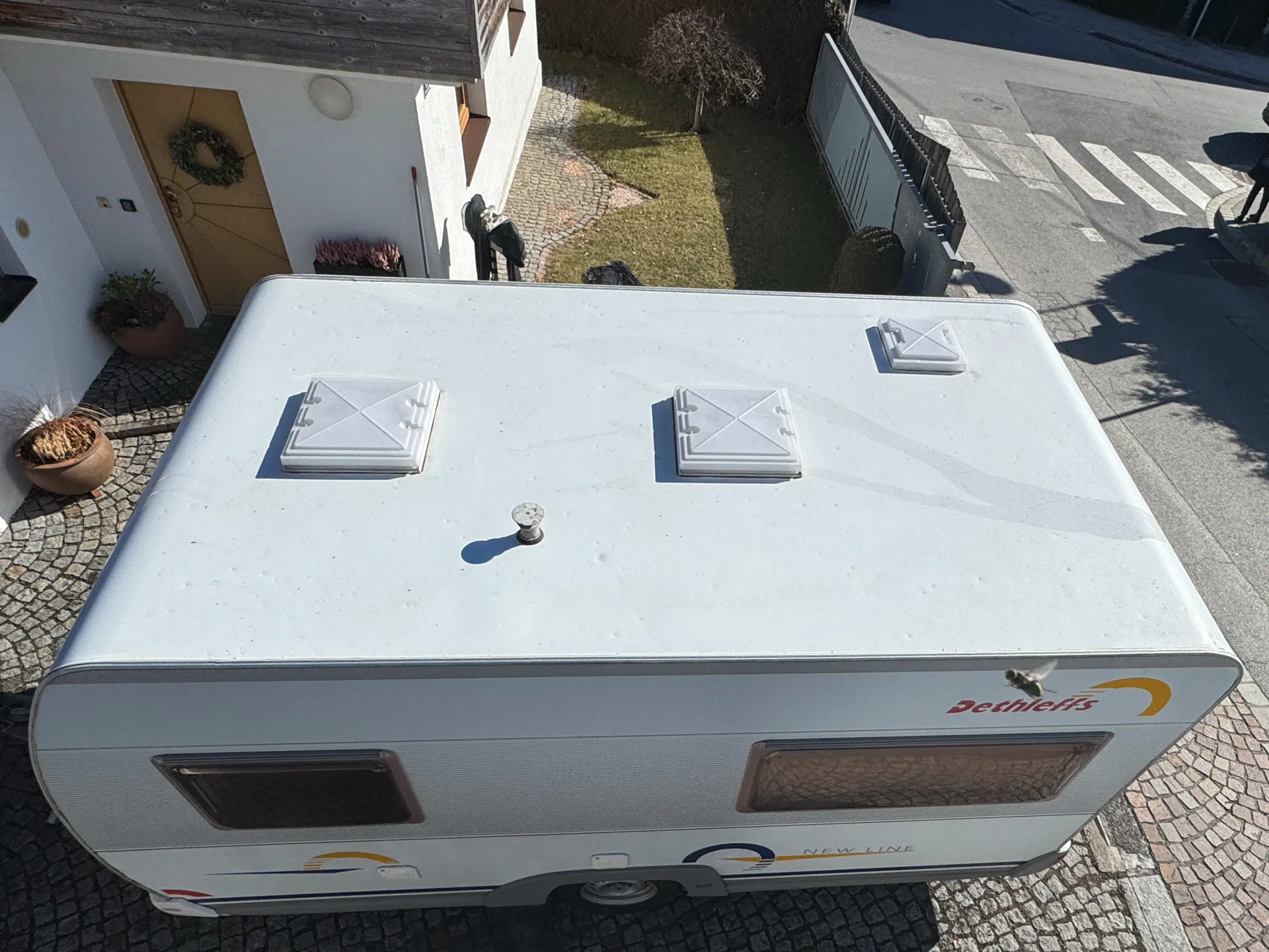 Am Dach sind einige Dellen (von herabfallenden Pinienzapfen etc.) vorhanden.