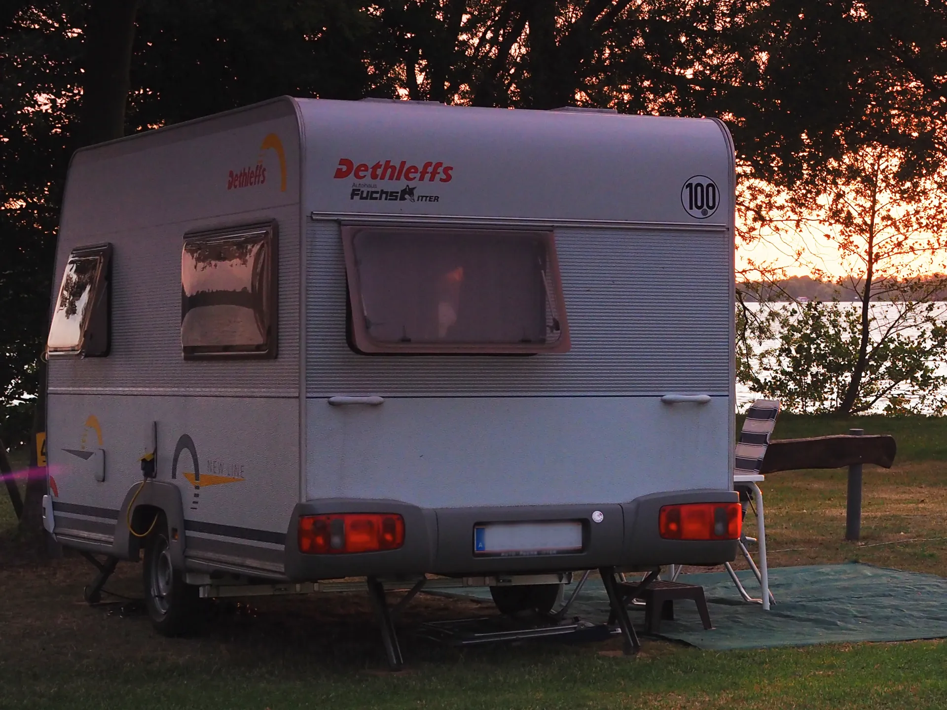 Im Preis inbegriffen ist ein mit Reissverschlüssen verschließbares Vorzelt, eine grüne Bodenmatte für das Vorzelt, 3 Komfort – Campingstühle und ein stabiler Tisch (siehe Fotos), Camping Geschirr und Besteck, sowie diverse Kochuntensilien.